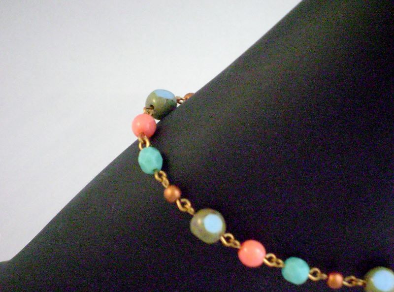 This handcrafted beaded anklet is 10 ΒΌ inches long with round coral beads, faceted aqua beads, and blue and green geometric shaped beads and copper beads. It has a gold tone screw in clasp for extra security. This multi coloured anklet will go with any outfit from jeans to everyday wear.