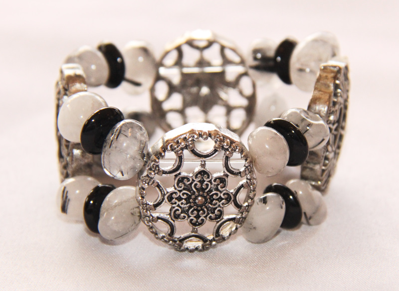 This is a 7 ½ inch stretchy bracelet when relaxed. The bracelet was handcrafted with white and black chunky agate beads, black disc beads and decorative connectors.  A bracelet for any occasion.