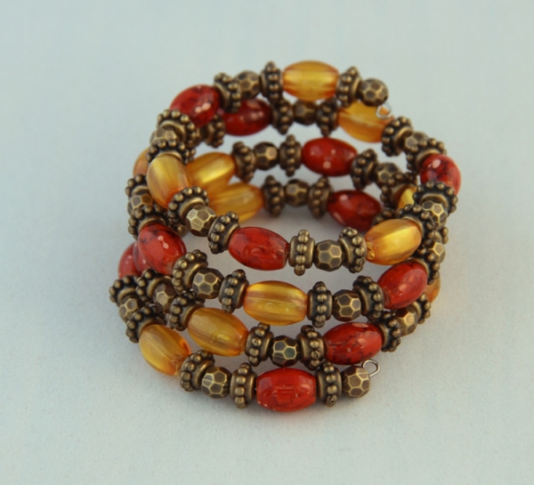 Memory wire or cuff bracelet made of yellow, orange, and brass beads with brass spacers.