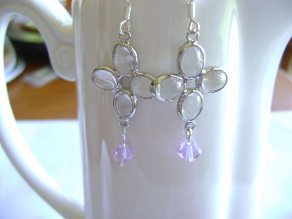 These delightful dangle drop earrings are 1 ½ inches in length excluding the ear wire. Created with Acrylic clear flower and a lilac Swarovski crystal.