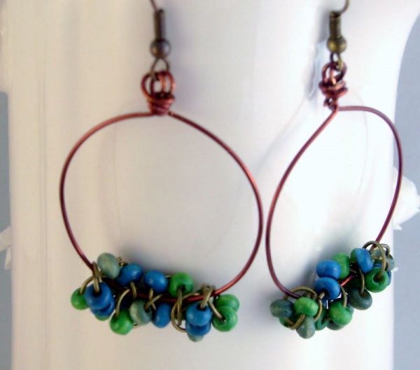 These Copper wire hoop earrings are 2 inches in length excluding the ear wires. The hoop is hand wrapped and there are blue and green seed beads around the bottom circumference of the earrings.