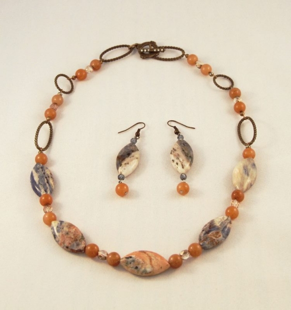 I made this necklace with oval shaped orange sodalite beads, carnelian beads, peach colored Swarovski beads and brass findings and a brass toggle clasp. The earrings are orange sodalite beads and carnelian beads. Sodalite is typically a deep blue mineral that gets its name from its sodium content. Apart from blue, sodalite can be grey, yellow, orange or pink. However, for gemstone use, sodalite is typically blue, and often has white veins running through it. Sodalite is also sometimes sold as "alomite", "blue stone" and "ditroite".