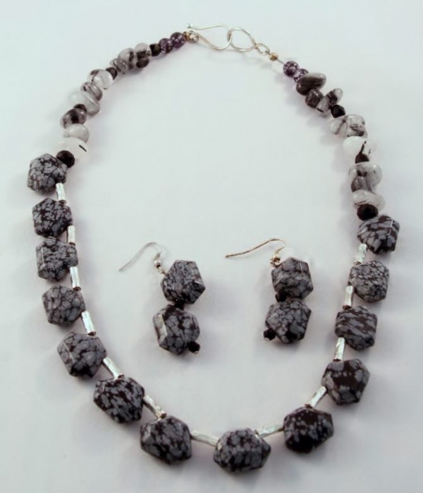 I made this necklace with irregular pentagon shaped snowflake obsidian beads, black and white agate chunks, Swarovski faceted beads and silver plated bars with a silver plated hook clasp. The earrings are irregular pentagon shaped beads and tiny black beads.