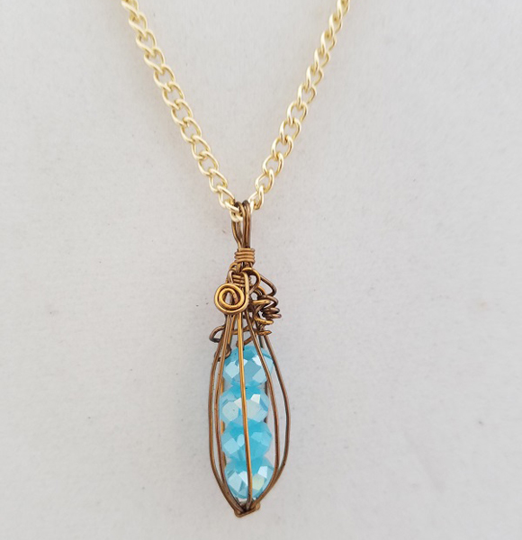 A handcrafted copper wire wrapped cage that is 1 ¾ “ encapsulating 4 blue Swarovski crystals. Hung on an 18” gold chain.